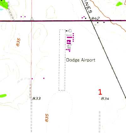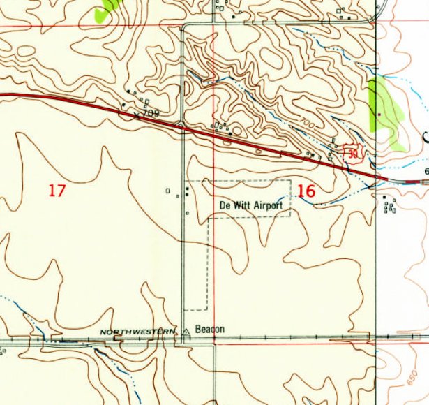It depicted De Witt as having 2 perpendicular unpaved runways, with a small building on the northwest side.