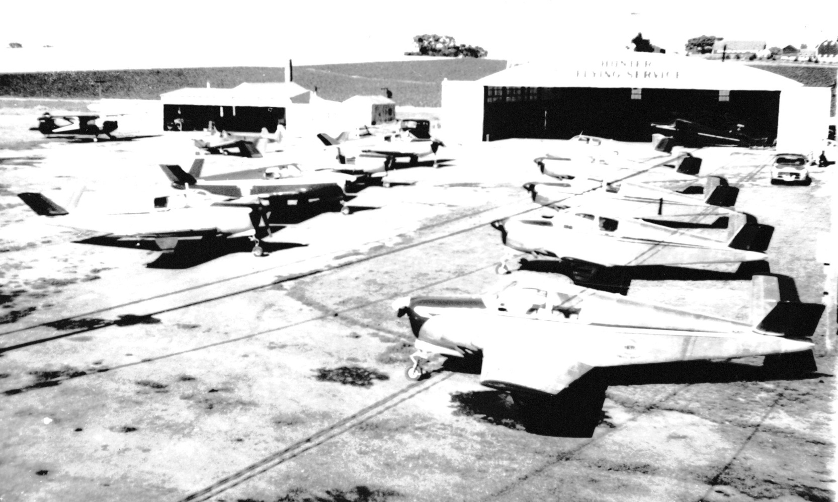 A circa 1947-53 photo by Charles Sheets (from Ann Pellegreno's book Iowa Takes To The Air) depicted 8 shiny new Beech Bonanzas in front of the Hunter Flying Service hangar.