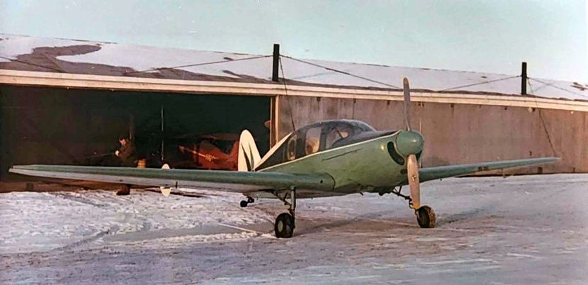 An early 1970s photo (courtesy of Christine Robbins via Nick Williams) of Gene Shea's Bellanca Cruise Master in front of the Bantam Airport hangars where it was kept.