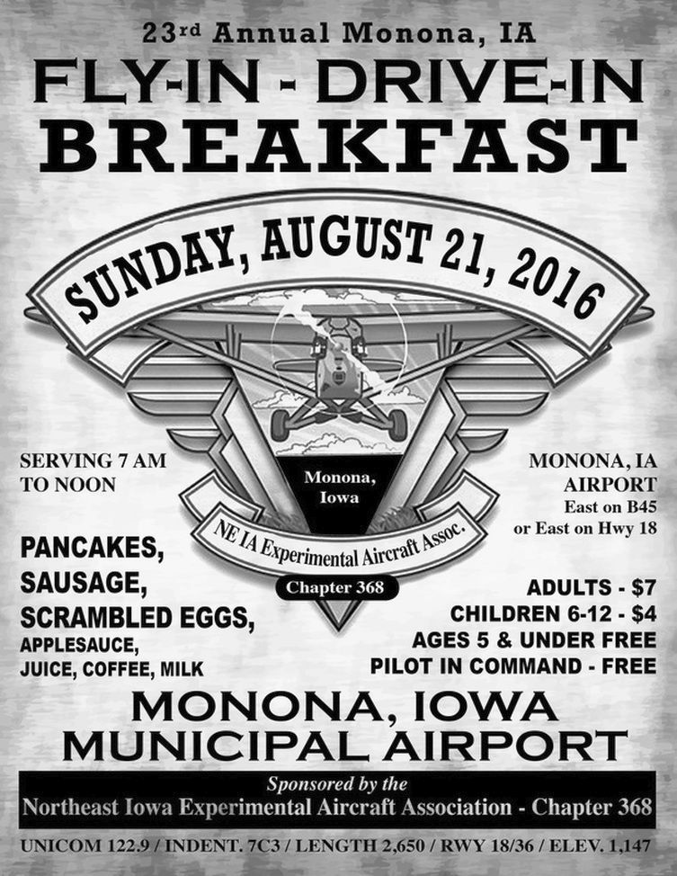 An advertisement for a 8/21/16 Fly-in Drive-In Breakfast at Monona Municipal Airport.