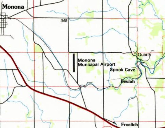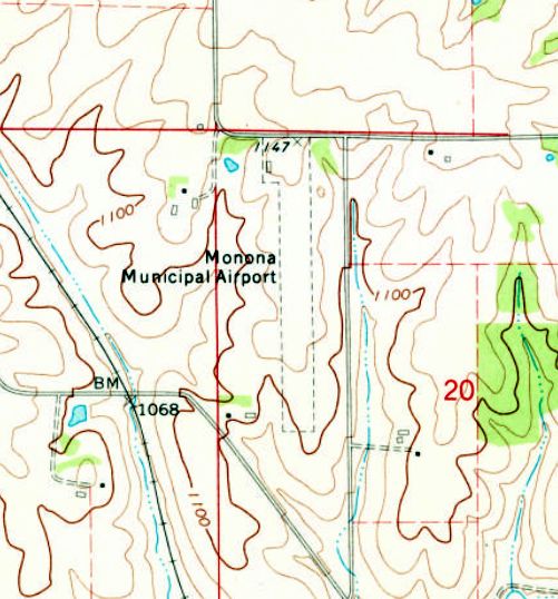 The last topo map depiction which has been located of Monona Airport was on the 1985 USGS topo map. It depicted a single north/south runway.
