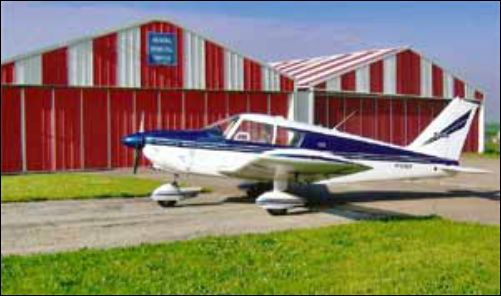 A 2024 or earlier photo of a Piper Cherokee in front of the 3 red hangars on the northwest side of Monona Airport.