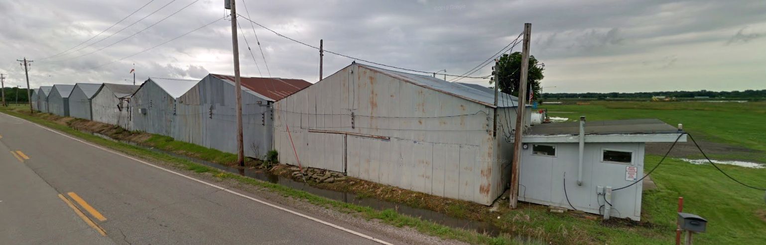 A 2024 or earlier photo of the 3 red hangars on the northwest side of Monona Airport.