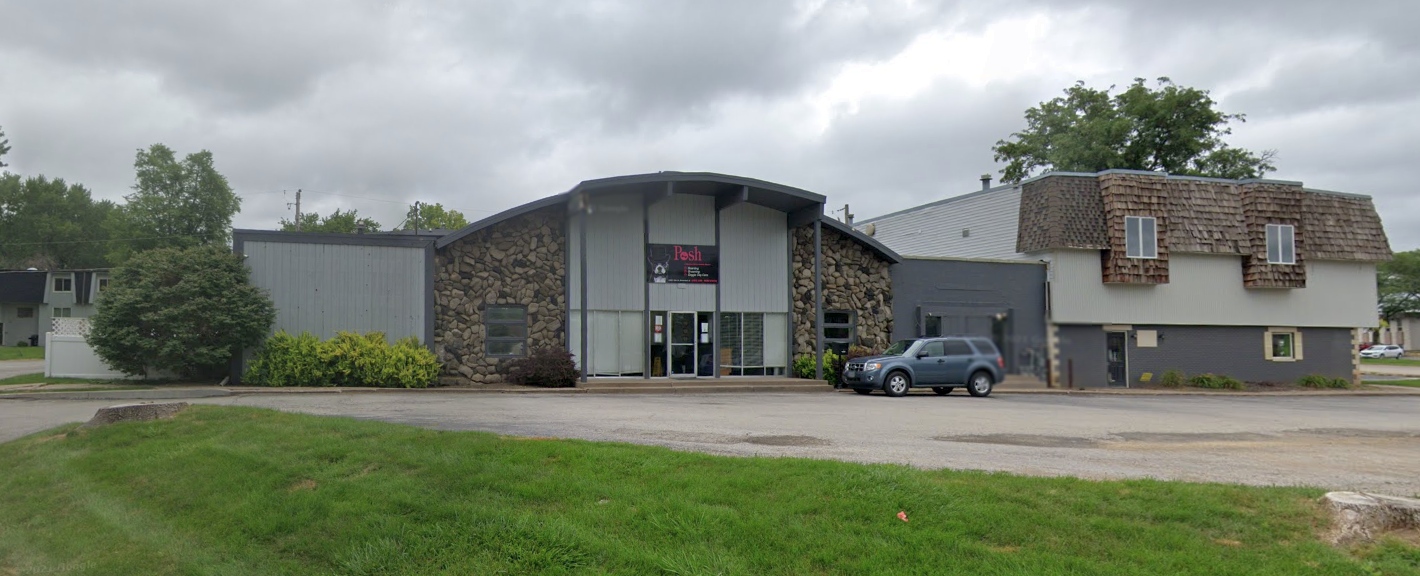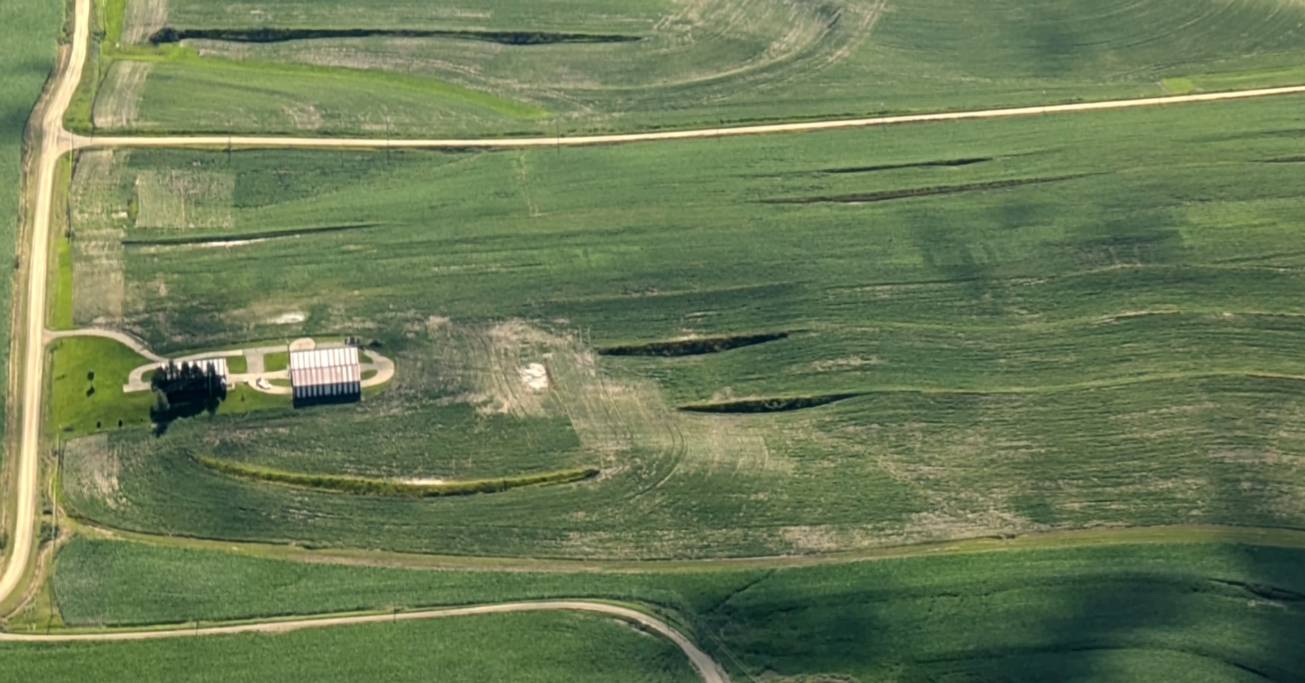 A 6/30/24 aerial view by Nick Paxton looking east at the site of Monona Airport. Nick observed, “The hangars & building are still there (left side of the picture, the red striped buildings).”