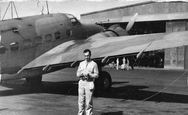 A circa late 1940s photo of Paul Orrick in front of a Lockheed at Hunter Airport.