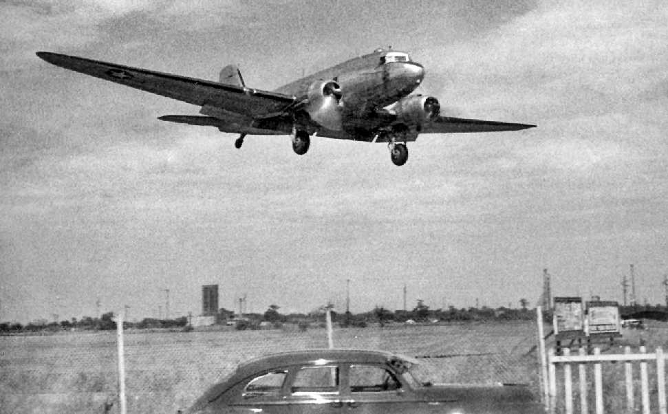 A circa late 1940s photo by Harry Cole “of a C-47 on final approach with gear down about 20-30' above the ground & north of Minnesota Street”, landing at Stout Field.