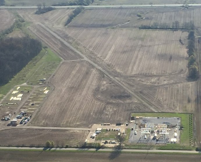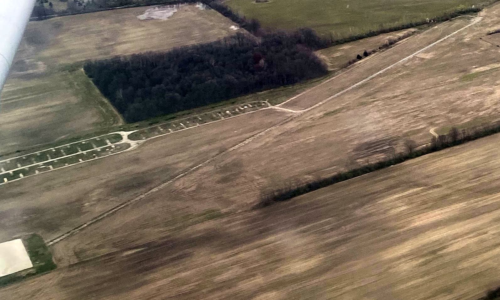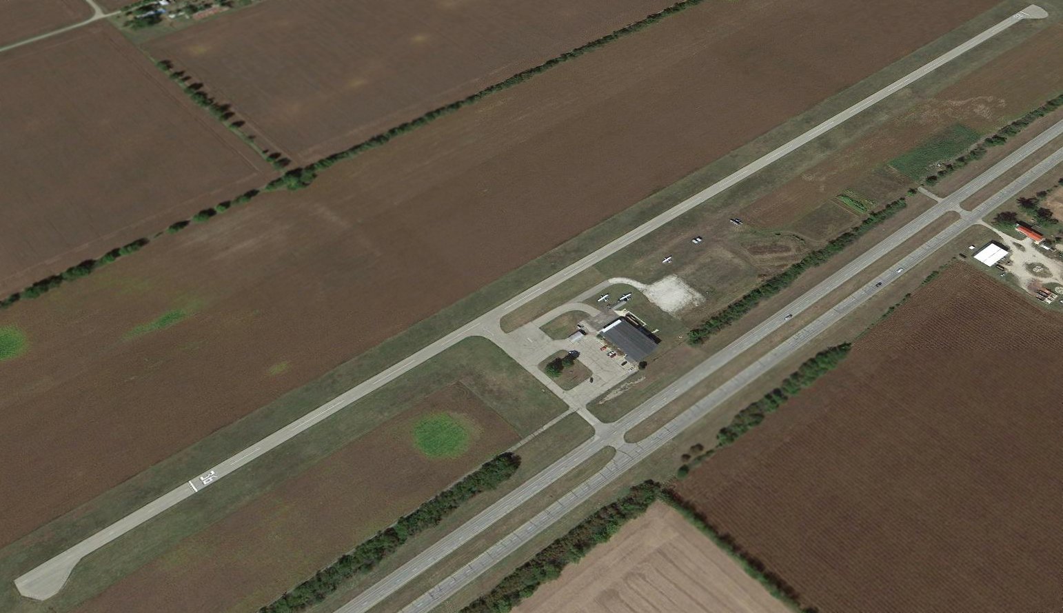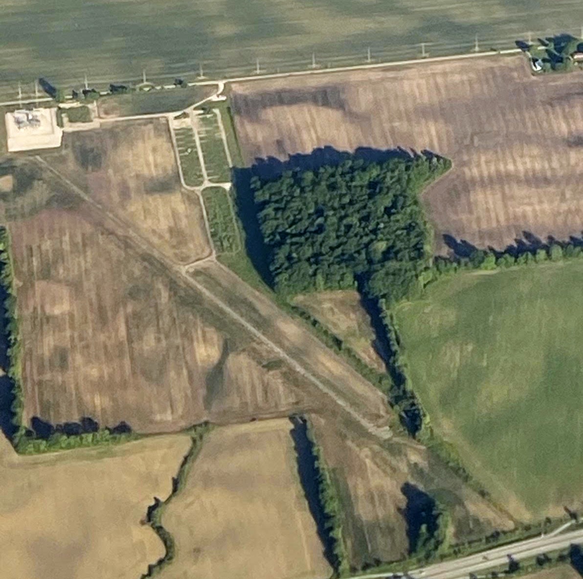 A May 2019 photo looking south along the former Stout Field Runway 15, with the former hangar visible at top-left.