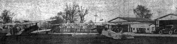 A circa 1918 photo of unidentified biplanes in front of Indianapolis Motor Speedway hangars (courtesy of Eric Lawrence).