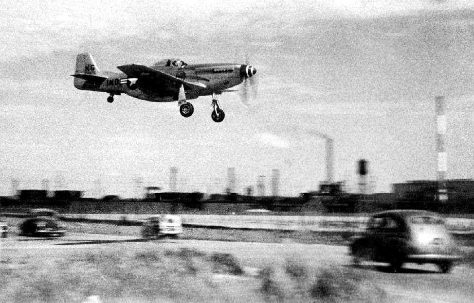 A circa late 1940s photo by Harry Cole of a National Guard “P-51 Mustang about 20-30' above Minnesota Street, gear down heading to a landing” at Stout Field.
