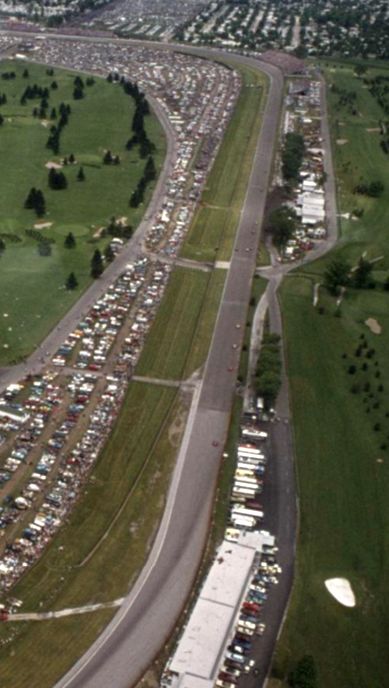 Eric Lawrence observed, “This photo from the outside of Turn 2 shows the vehicle & pedestrian bridge over Turn 2, the balloon hangar, and the aircraft hangar complex to the extreme left of the picture.”