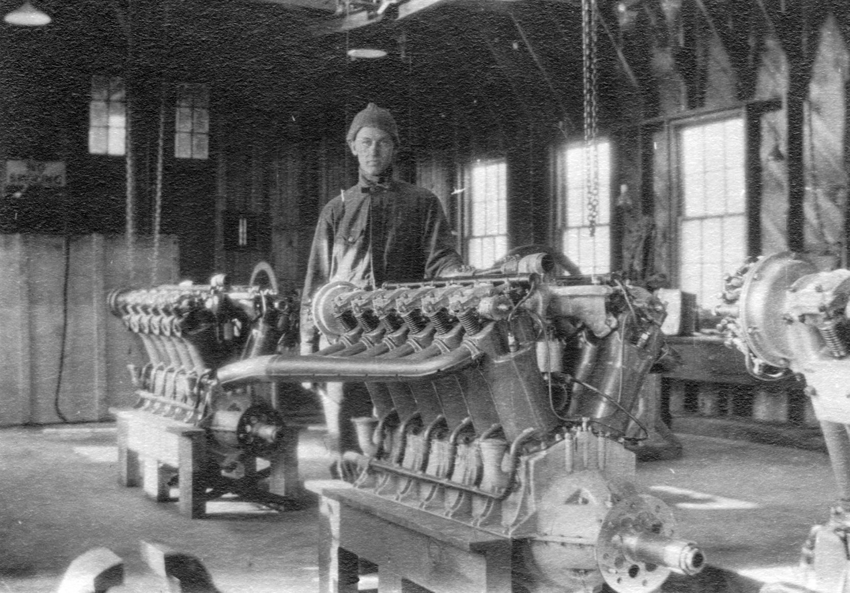 A 1918 photo of Liberty aircraft engines inside the Indianapolis Motor Speedway Aviation Repair Depot engine repair shop (courtesy of David Parker).