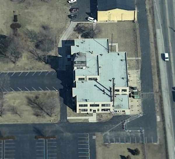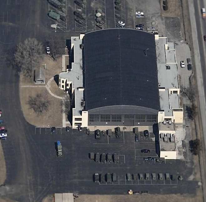 A circa 2005 aerial photo looking north at 1 of 2 remaining hangars at Stout Field, on the southeast corner of the base.