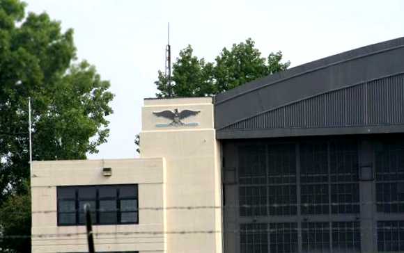 A 2008 photo by Dick Merrill of a military emblem on a former hangar at Stout Field.