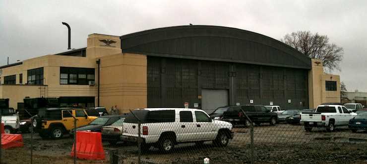 A May 2019 photo looking northwest at a former Stout Field hangar which remains on the southeast corner of the site.
