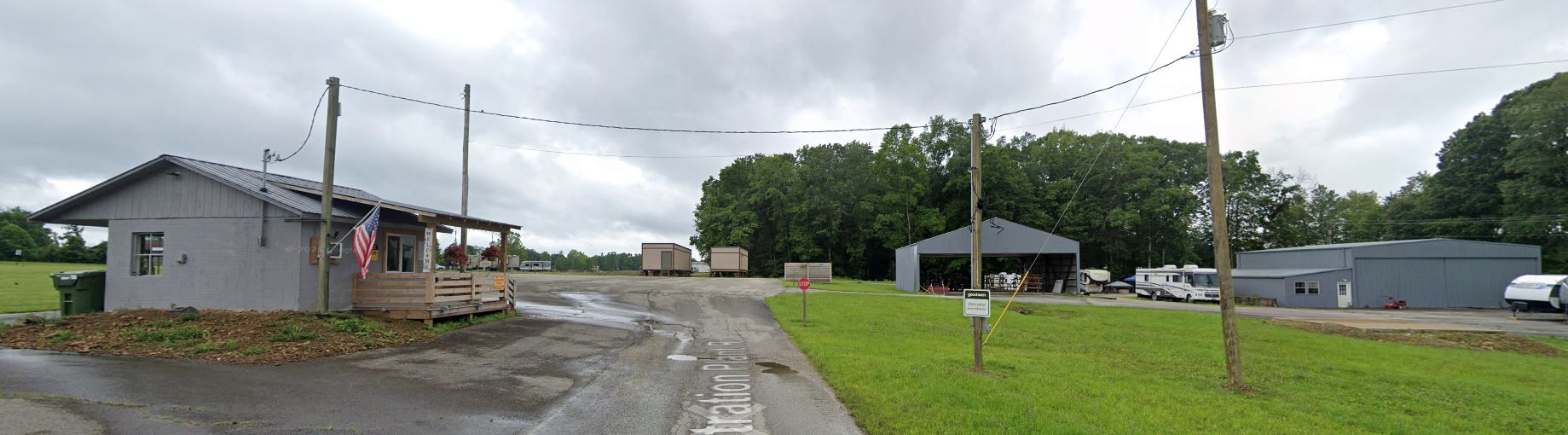 A 2025 photo looking southwest at the former Rowan County Airport office & hangars.