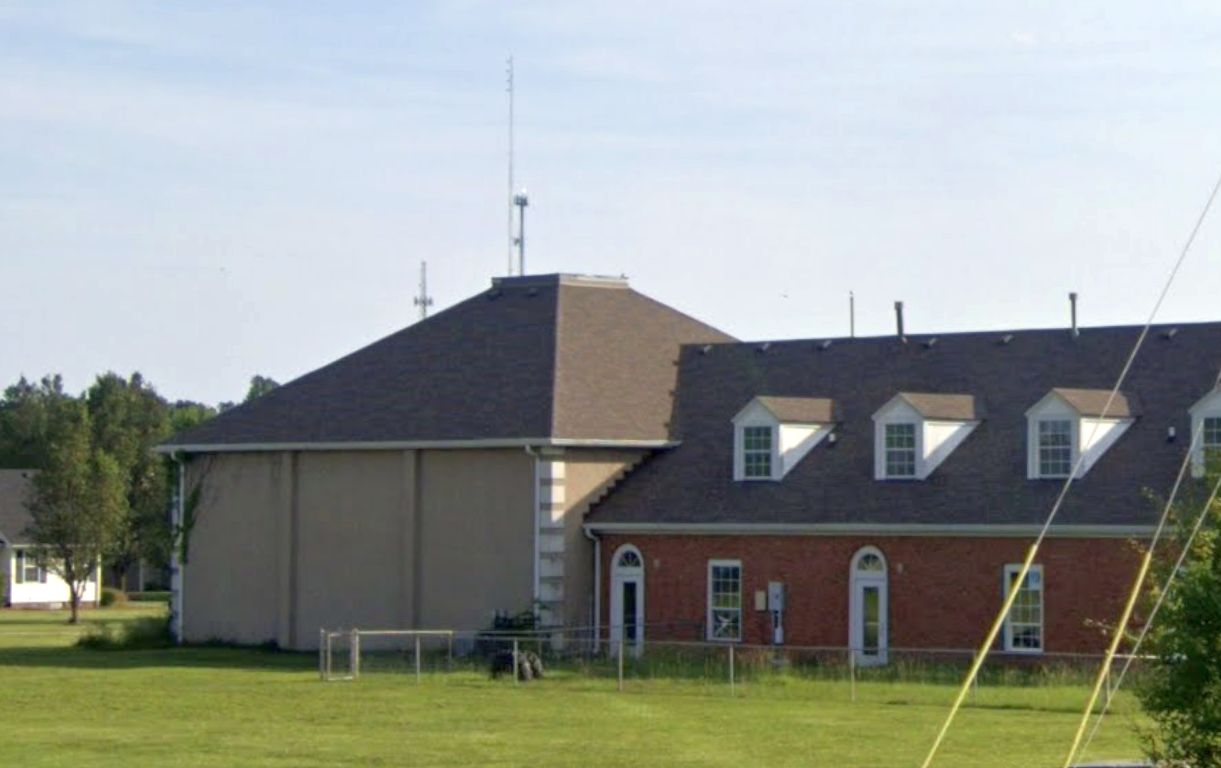 A 2023 photo view looking northeast at the building on the west side of the West Point Airport site. The smaller building to the right may be a former hangar.