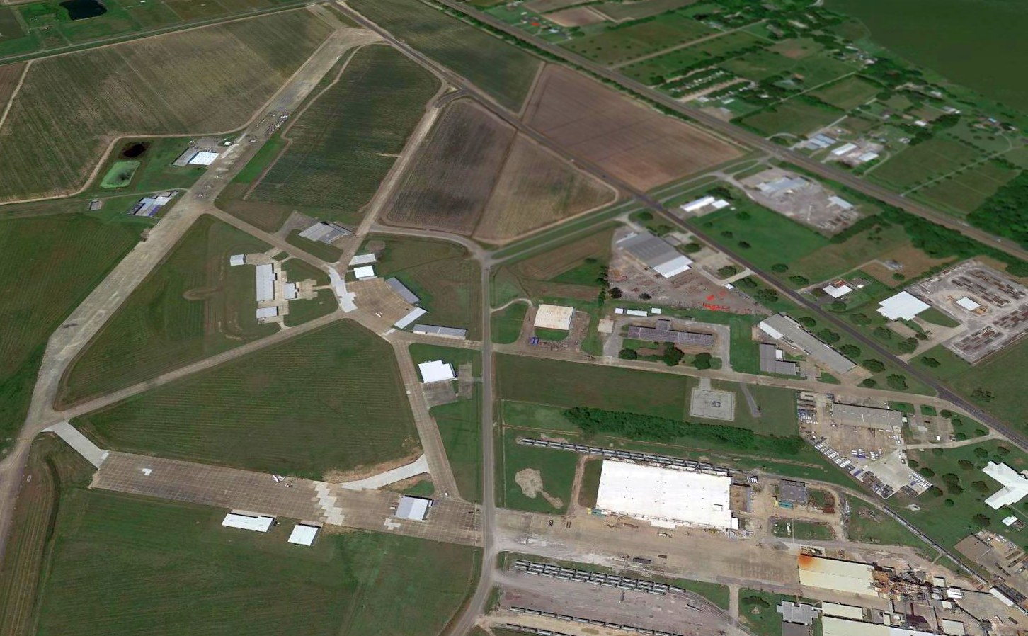 A 2016 aerial view looking north of the abandoned runways of the former Iberia Parish Airport, with several helicopters on the northeast/southwest runway,