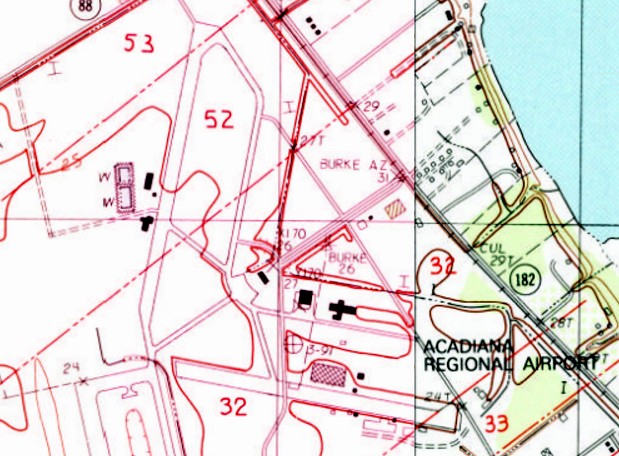 The abandoned runways of the former Iberia Parish Airport were still depicted on the 1983 USGS topo map.
