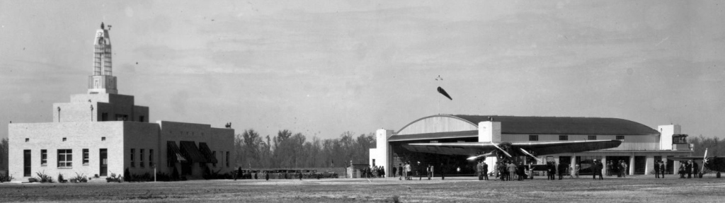 A circa 1930s photo of the terminal, hangar, and a Fokker Trimotor at Baton Rouge Municipal Airport.