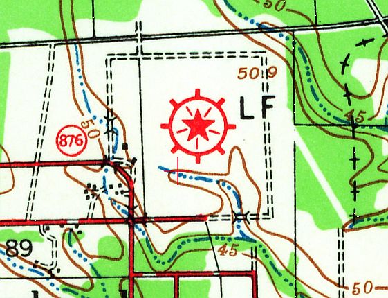 The 1981 USGS topo map depicted a single unpaved north/south road (what may have been an early depiction of the runway) with several small buildings along the west side,