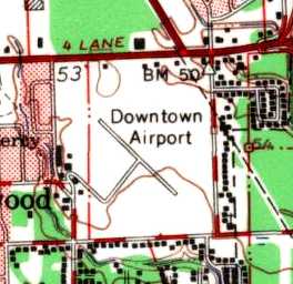 As seen in a 1989 USGS aerial view looking north, the area around the site of Baton Rouge Downtown Airport had been surrounded by dense development,