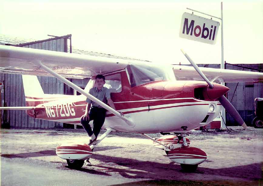 A 1967 photo looking northwest at Robin Elston at age 11 after a flight with his dad in Cessna 150 N6720G at Lucien Airport,