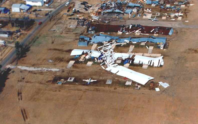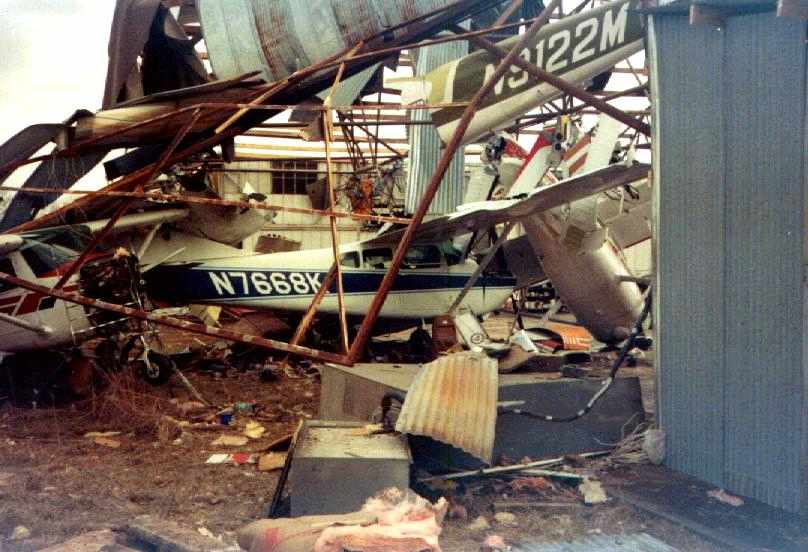 A 1990 photo by Robin Elston looking east from the northwest corner of the hangar at the aircraft salvage yard.