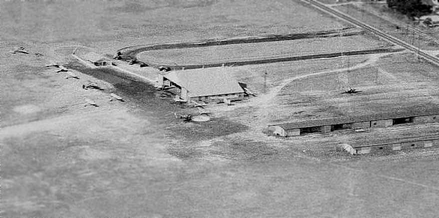 A 1962 aerial view looking north at the Lucien Field hangar, with 18 planes on the field (courtesy of Rick Shelton).