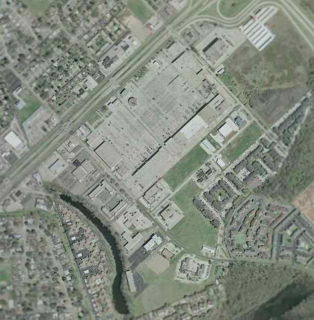A 2014 aerial view looking southeast shows the majority of the former Ruston Municipal Airport runway remains intact, along with the largest hangar,