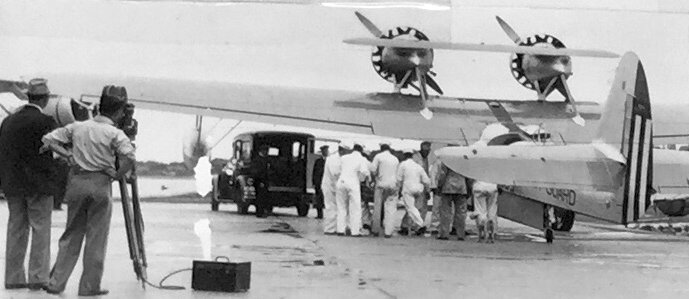 A 6/12/38 photo by William Jeffrey of an RKO Studio crew filming a twin-engine amphibian flying boat (model unidentified) for the movie “Coast Guard” (released 1939) at Coast Guard Air Station Salem