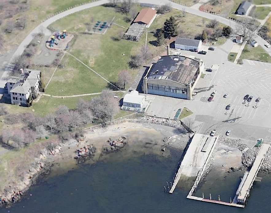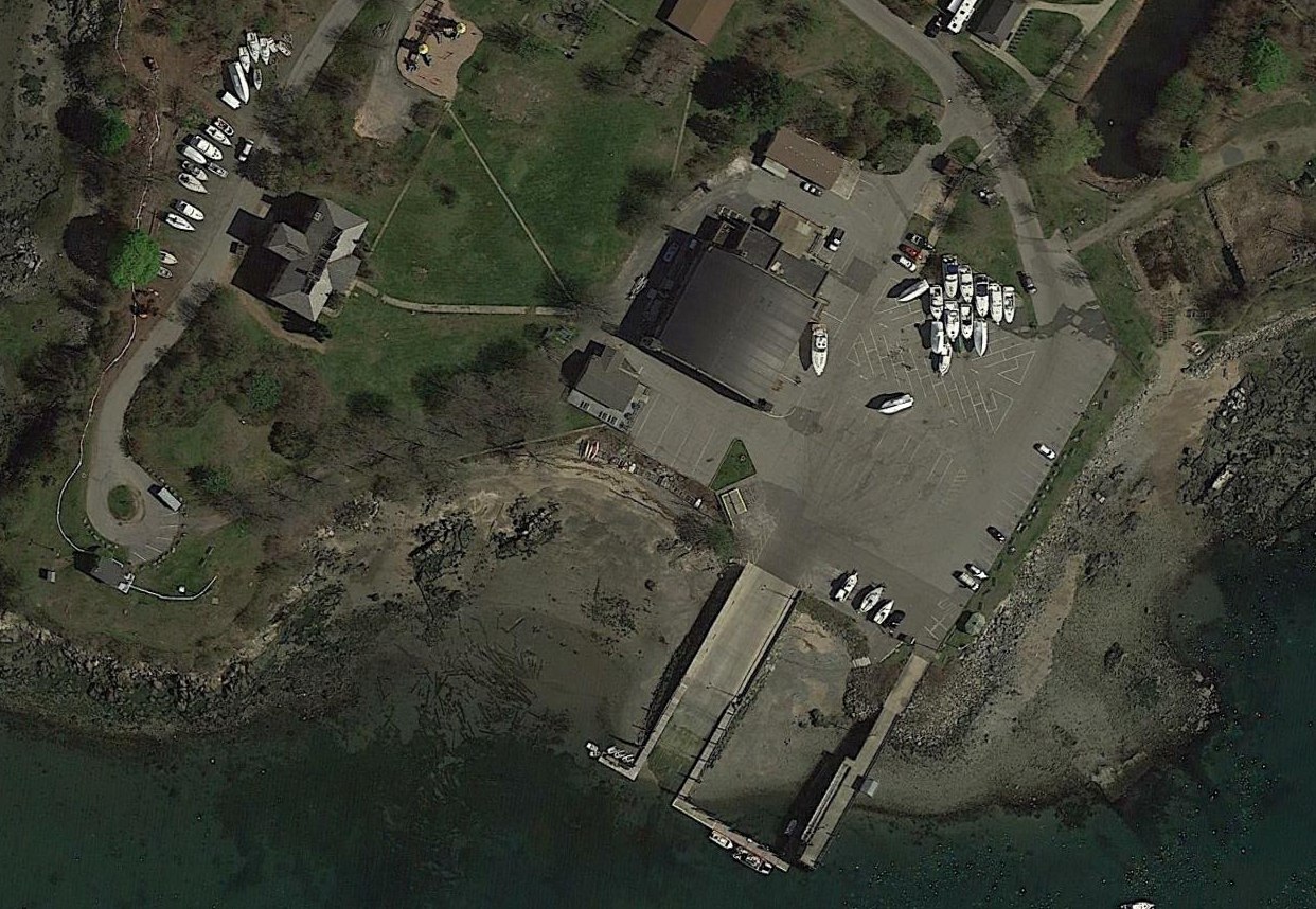 and 2 seaplane ramps leading down into the waters of Salem Harbor.