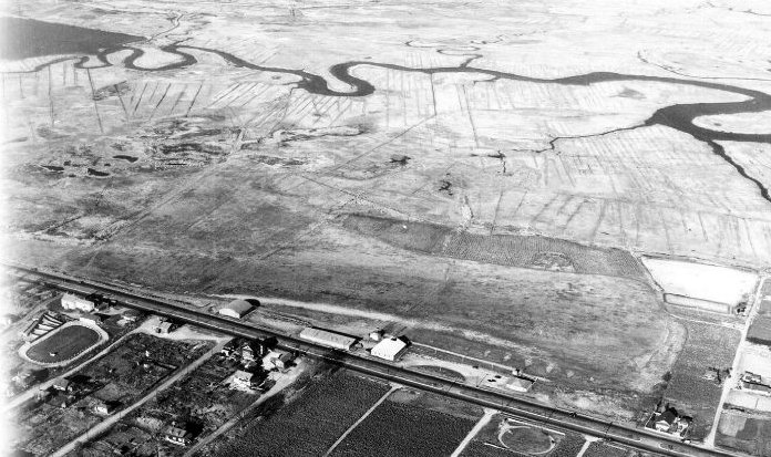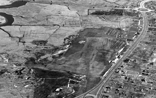 A 1964 aerial view (courtesy of Lou Spagnola) looking northwest at the northern portion of the Revere Airport site, covered by the Northgate Shopping Center.
