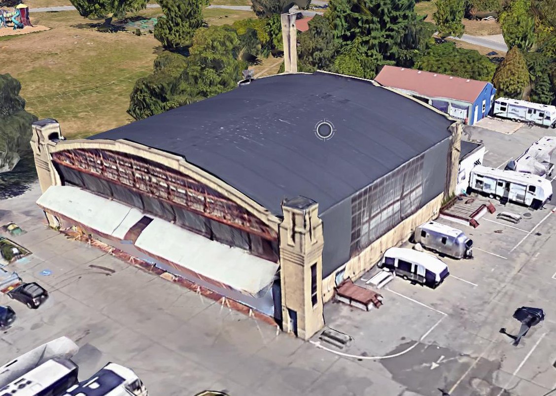 A circa 2010-2017 3-D aerial view show of the former CGAS Salem seaplane hangar.