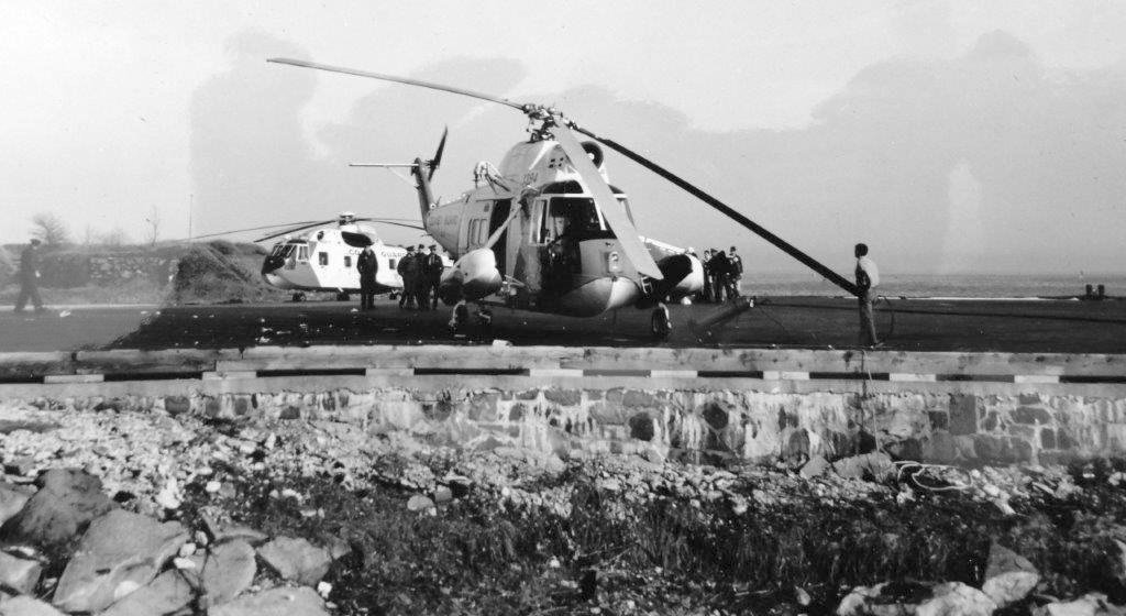 An undated (circa late 1960s?) photo of a Sikorsky HH-3F Pelican & a damaged Sikorsky HH-5A Seaguard at CGAS Salem (courtesy of Ron Janard).