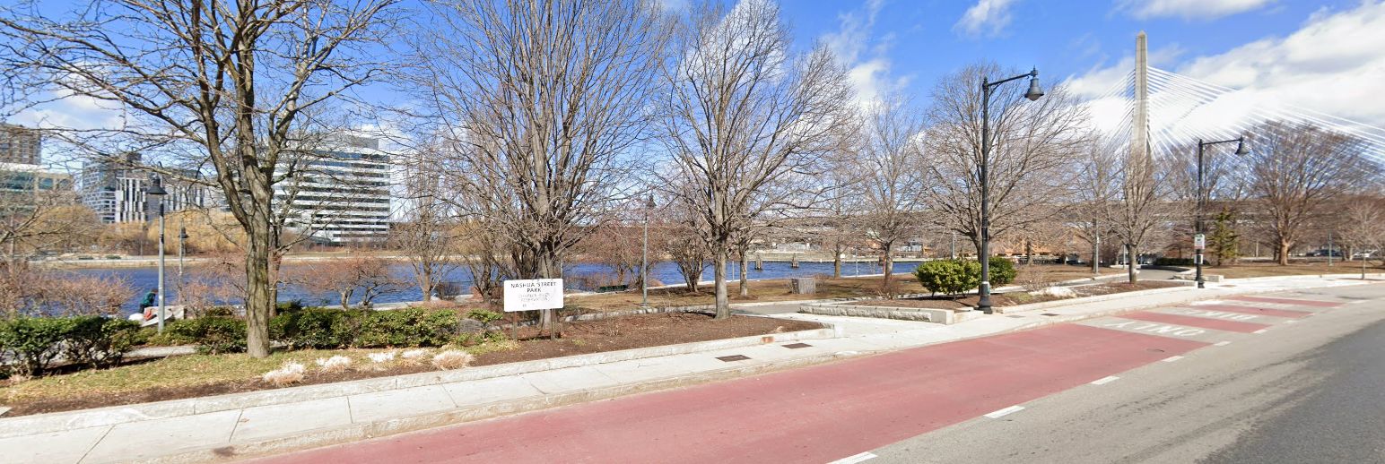 A 2022 photo looking north at the site of the Boston Nashua Street Heliport, reused as Nashua Street Park.