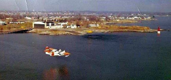A circa 1960s aerial view looking north at a Gruman HU-16 Albatross overflying Coast Guard Air Station Salem (courtesy of Ron Janard).