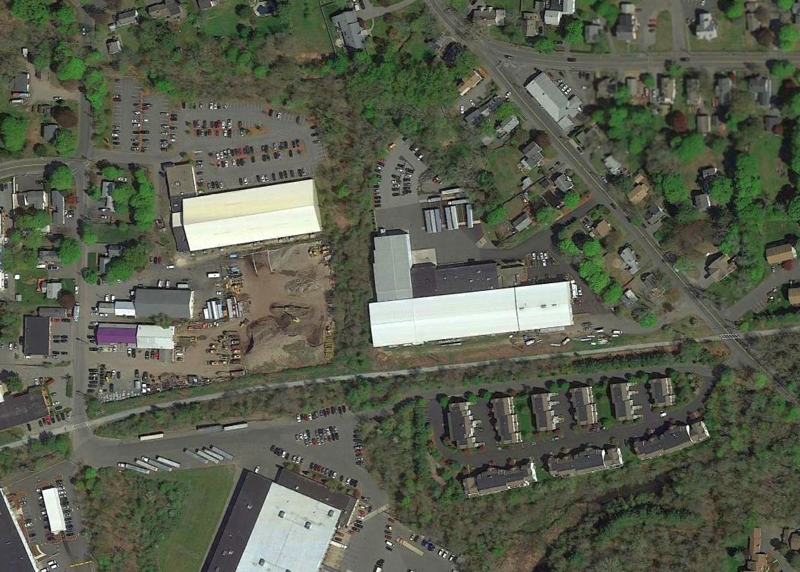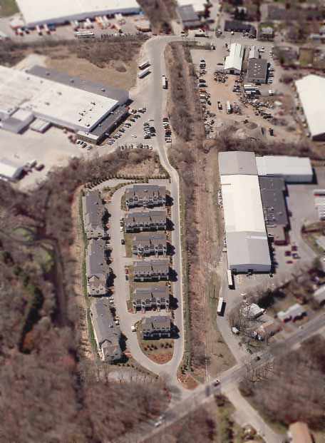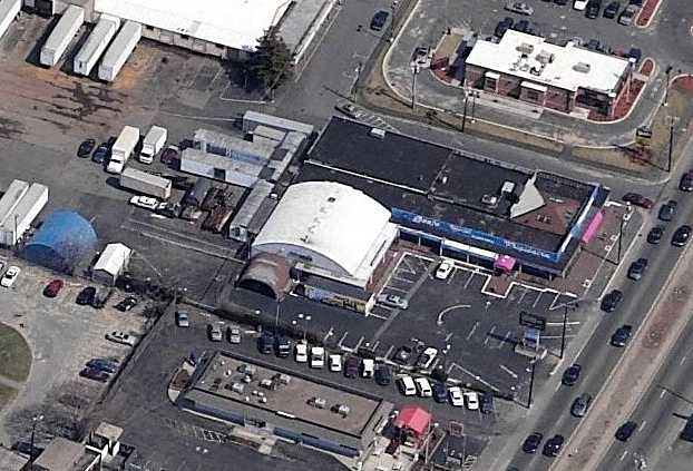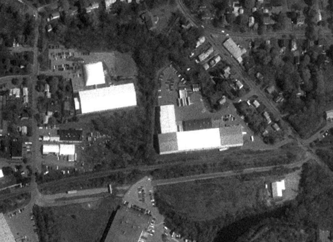 A circa 2006 aerial view looking east at an former hangar which remains standing on the southwestern portion of the former airport, reused as a Sozio furniture store.