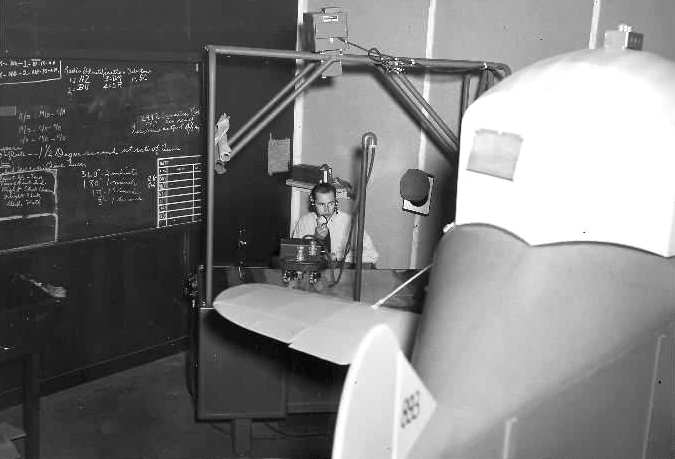 at the instructor station of a Link Trainer (an early flight simulator) at CGAS Salem.