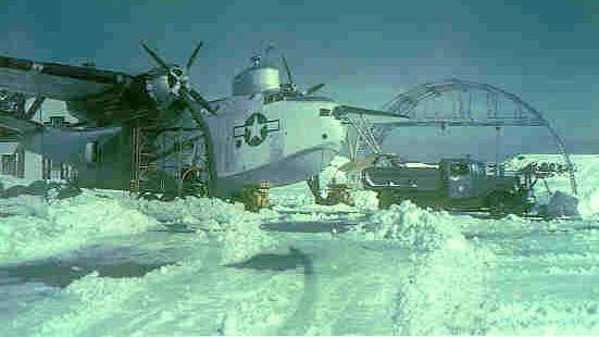 An undated view of a PBM flying boat on a snowy ramp at Salem.