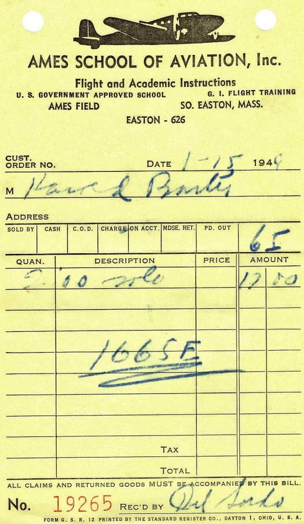 A 1/15/49 receipt for $17 of flying lessons from the Ames School of Aviation for Harold Barter (courtesy of Jim Locke).