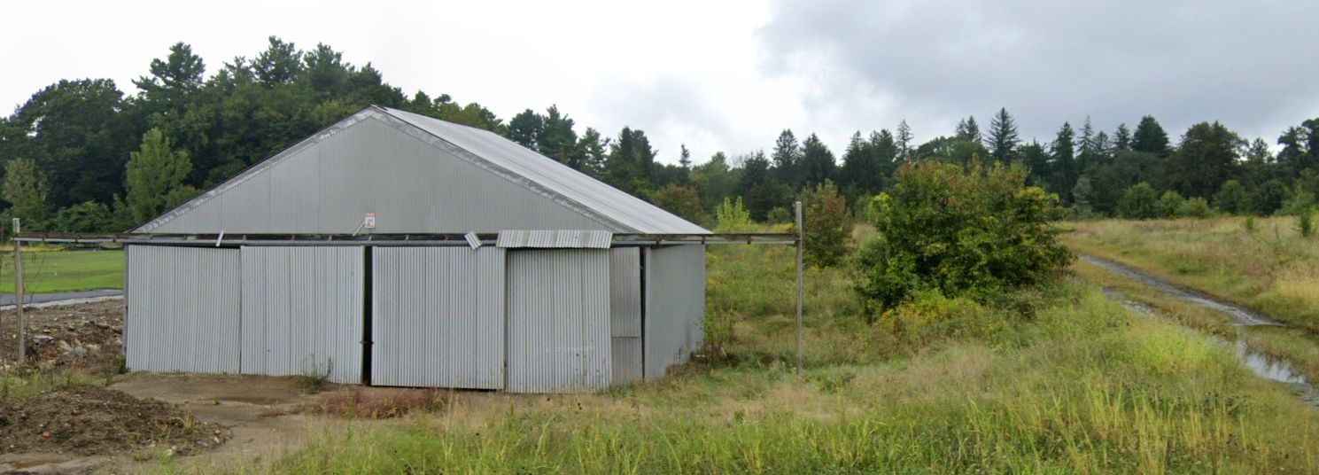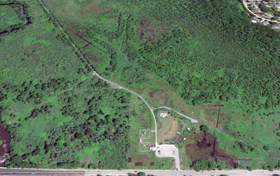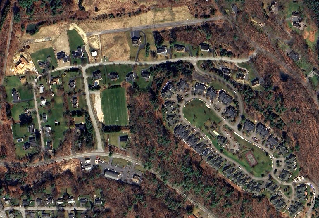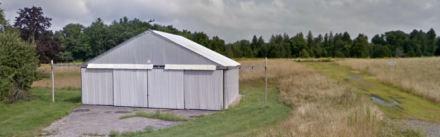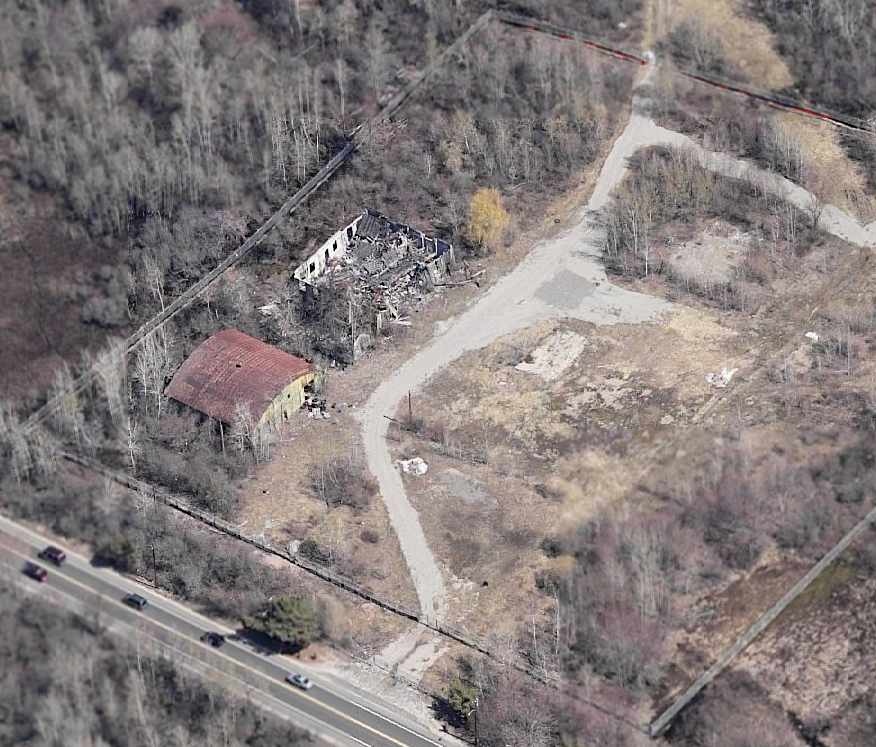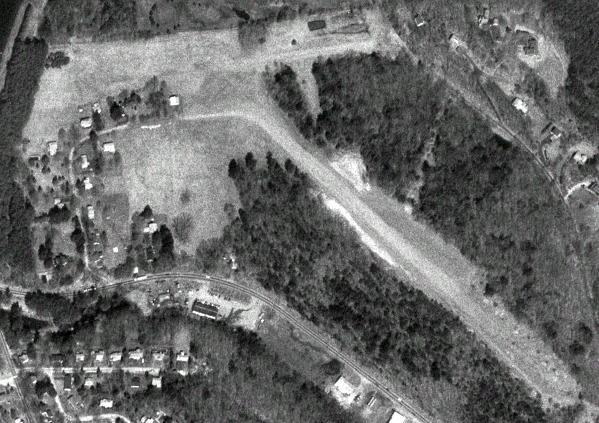A 2019 aerial view looking northeast showed the former Boston Metropolitan Airport runways were still barely recognizable in the woods, with the site of the 2 hangars at the southwest corner of the field.