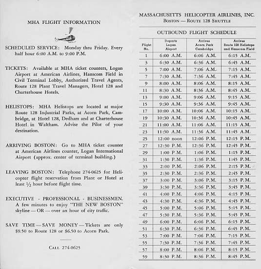 According to Jonathan Westerling, around 1965, “Massachusetts Helicopter Airlines had initiated a service ferrying people to & from Boston's airport