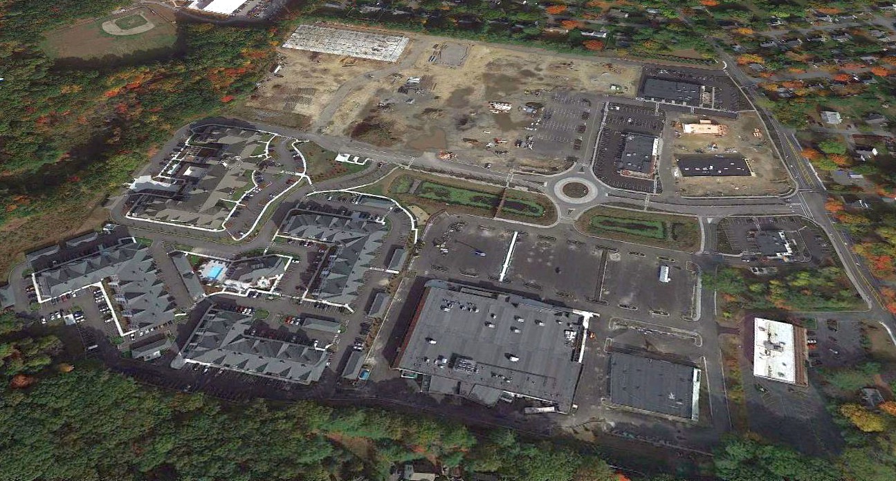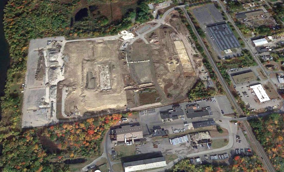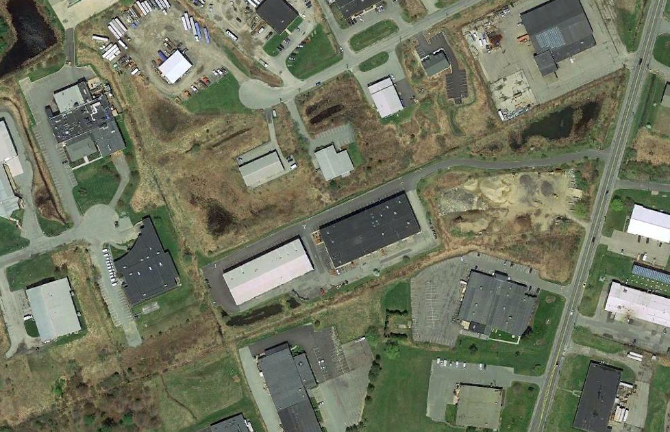 A 2020 aerial view looking north showed a storage building covering the former Haverhill Riverside Airport runway, but the former hangar remained in the center of the site.