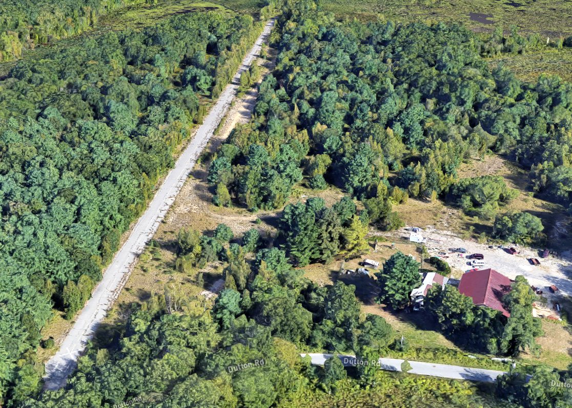 A 2024 3-D aerial image looking east at the remains of Haverhill-Dutton Airport's Runway 14 & its hangar.