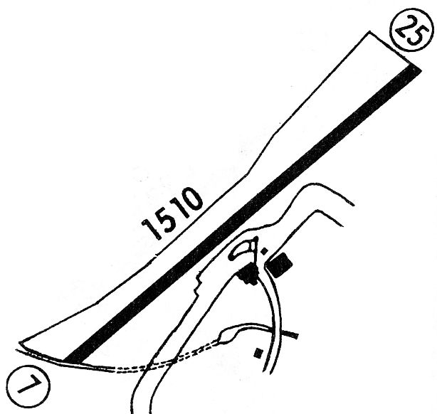 as having a single 1,510' paved Runway 7/25, with 2 buildings on the southeast side.