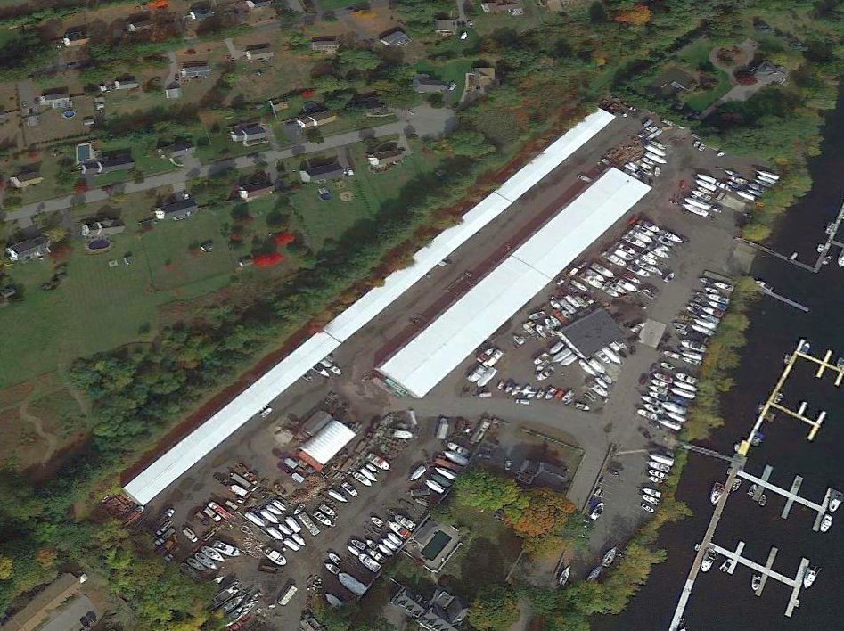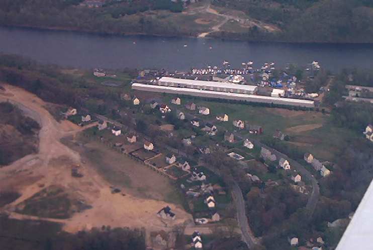 A 2003 photo by Lee Walus of the former runway area of Haverhill Riverside Airport, now covered almost entirely by long boat storage buildings.