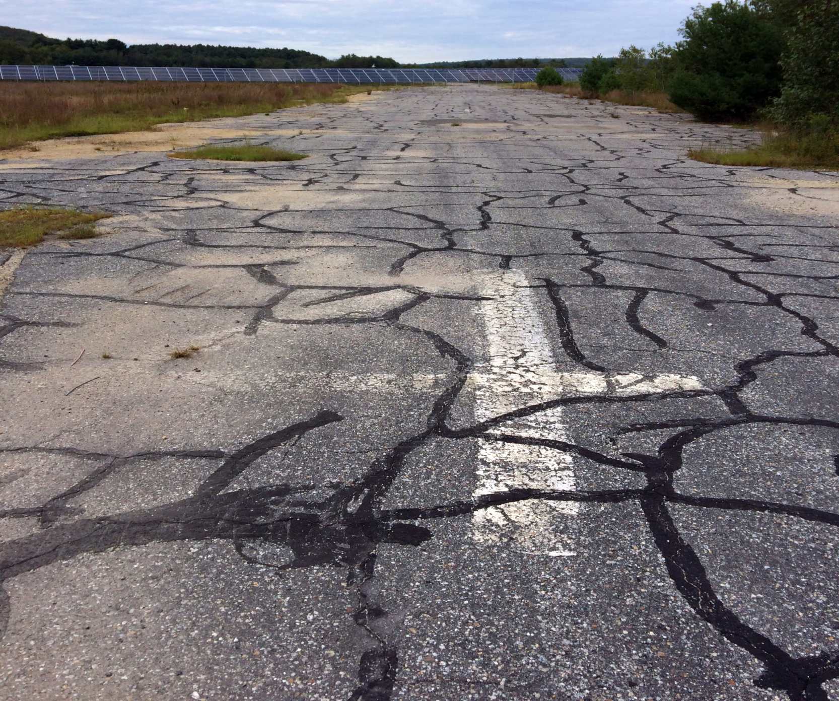 with the [runway number] 4 still intact, and the solar panels covering most of the field visible in the background.”