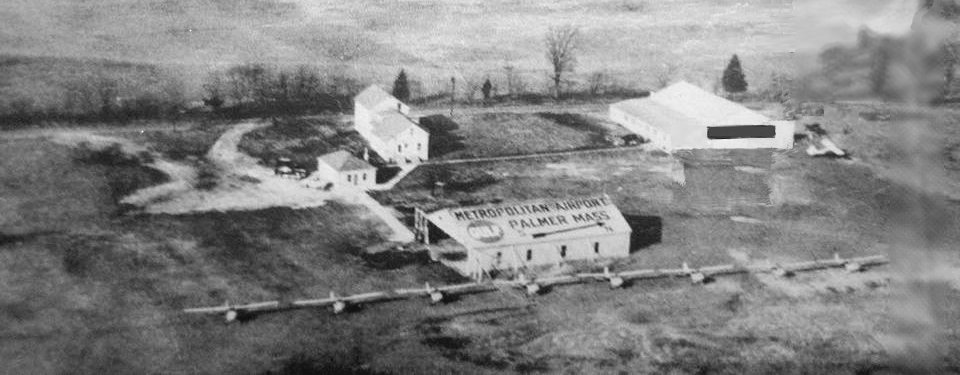 A circa 1960s-70s aerial view looking west at Palmer Metropolitan Airport (courtesy of Dean Charron), showing a row of single-engine planes in front of a hangar.