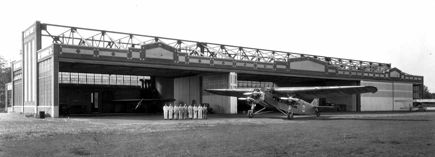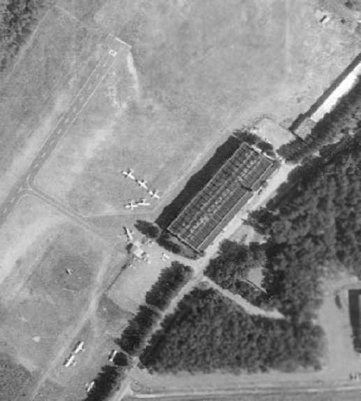 Two hangars were depicted on the southwest side of the field, with another larger hangar on the northeast side.