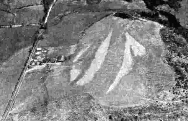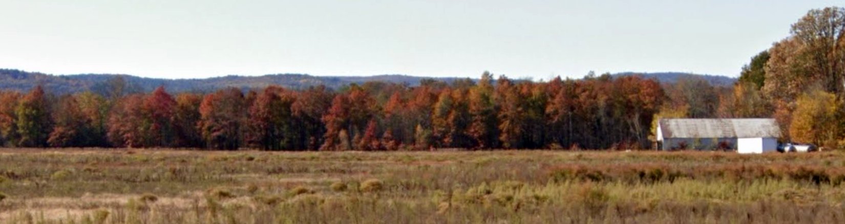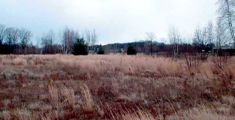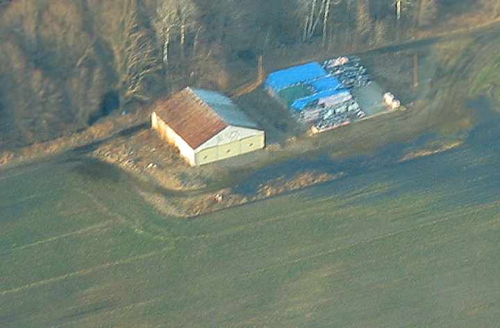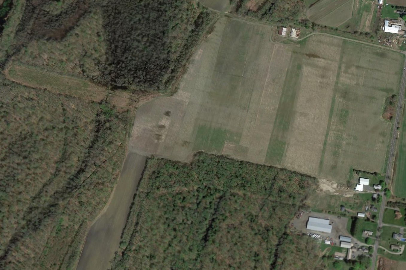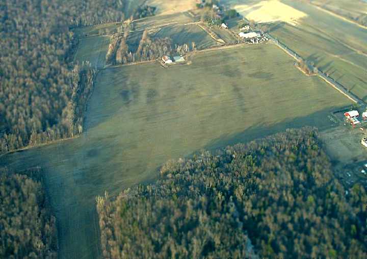 It depicted an open unpaved field, with 3 small buildings along the west side.